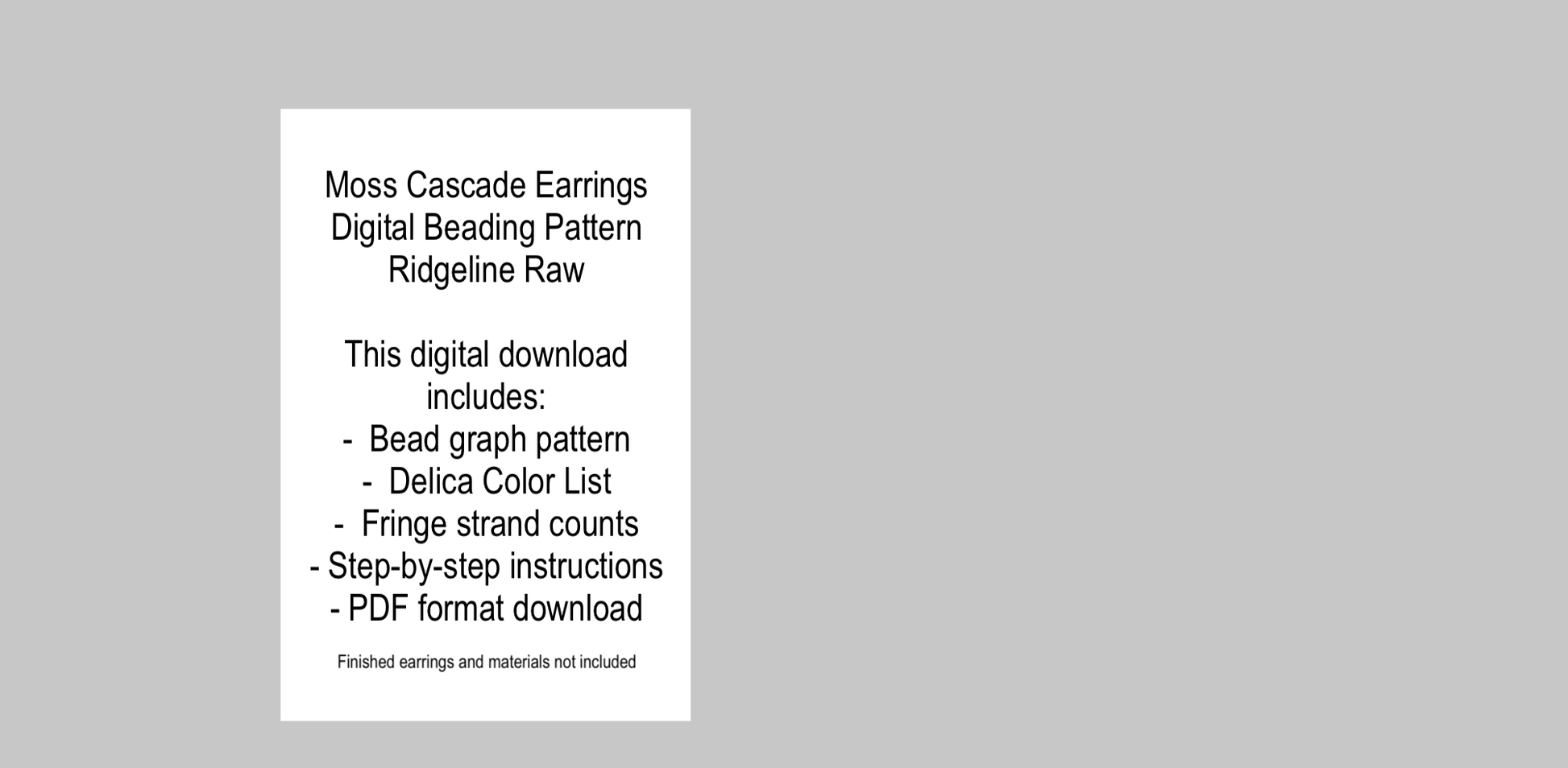 The Moss Cascade Fringe Earrings pattern was inspired by the layered textures of forest moss and weathered bark found along Wyoming ridgelines. This digital pattern creates an organic, cascading fringe design perfect for Delica seed beads.